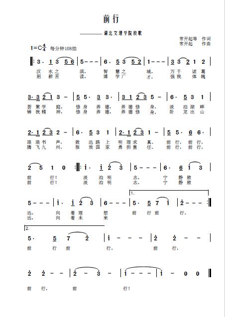 学校自2017年5月至2023年10月开展了校歌征集活动,经过三次征集、多次研讨、广泛征求意见、精心修改,并按程序审核,由音乐与舞蹈学院常开起教授等作词、常开起教授作曲的《前行》被确定为湖北文理学院校歌。
