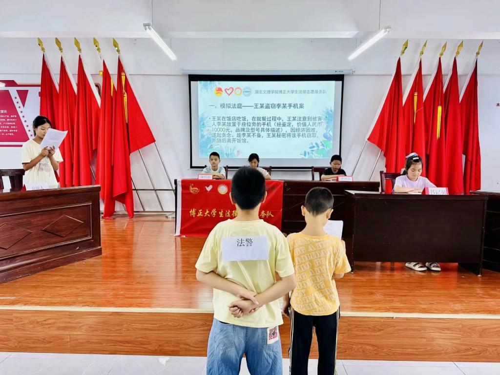 湖北文理学院博正大学生法律志愿服务队联合襄阳市襄城区隆中社区、尹集乡木桥村,以“暑假学堂”普法夏令营为宣传据点,开展了“法治启航”教育活动。志愿者们结合“模拟法庭”“暑期学堂”等多种形式进行法律知识宣讲、模拟审判实践的同时,更联合了“五老”志愿者向“幼芽”们零距离普法,告诉同学们要掌握好《中华人民共和国未成年人保护法》《反家暴法》等法律法规,帮助孩子们树立正确的法治观念,学会用法律武器保护自己,做遵纪守法的好少年。