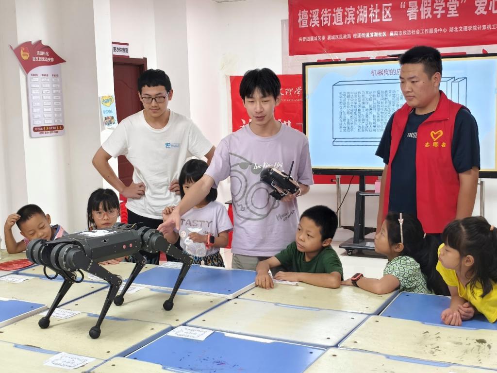 湖北文理学院计算机工程学院“芯连心”志愿服务队联合襄阳市致远社会工作服务中心,于滨湖社区“暑假学堂”开展计算机知识科普课程,把编程知识和“机器狗”操控引入课程教学环节。志愿者现场演示了使用python语言绘制出“懒羊羊”等图案,介绍了机器狗的技术原理,并频频操作着“机器狗”,使其行走、旋转、跳跃,孩子们争先恐后地与机器狗进行互动,现场气氛异常热烈。