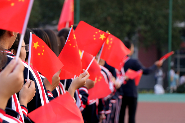 “我和我的祖国,一刻也不能分割,无论我走到哪里,都留下一首赞歌……”升旗仪式结束后,全场师生面对鲜艳的五星红旗,齐唱《我和我的祖国》。激昂的歌声、挥舞的红旗、师生脸上激动地神情汇织成汹涌的爱国情怀与暖流。