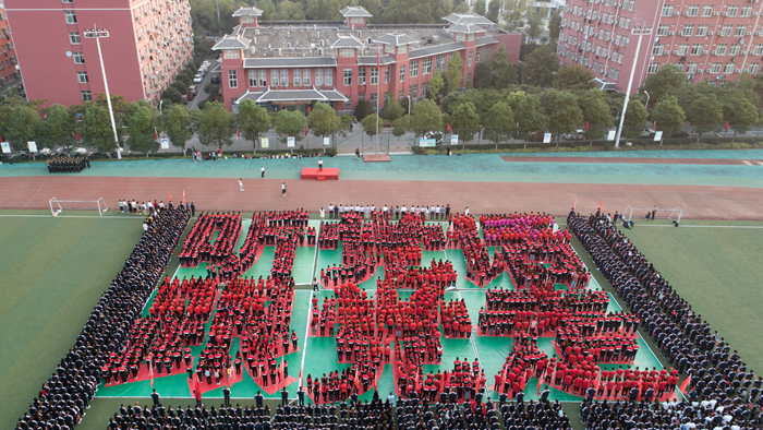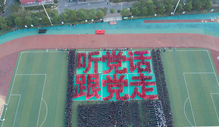 为庆祝中华人民共和国成立70周年,湖北文理学院举行庄严肃穆的升旗仪式,运动场上,身着红色衣服的学生组成“听党话,跟党走”字样,向祖国致敬,祝福伟大的祖国70岁生日快乐!表达了学校师生爱党爱国,为实现中华民族伟大复兴的中国梦而努力奋斗的坚定理想。
