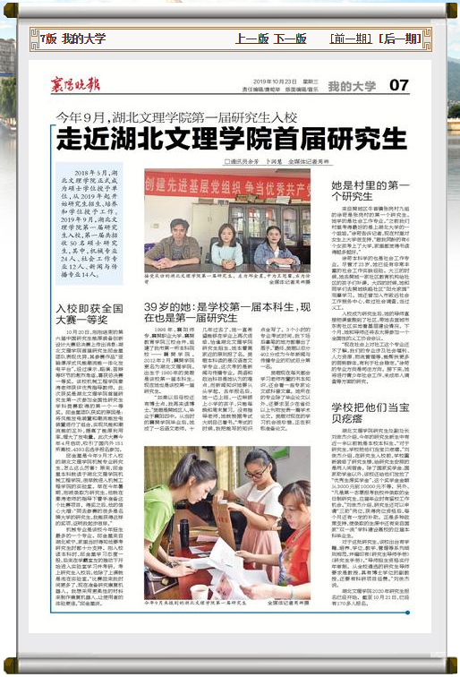 1998年,襄阳师专、襄樊职业大学、襄樊教育学院三校合并,组建了我市第一所本科院校——襄樊学院。2012年2月,襄樊学院更名为湖北文理学院。出生于1980年的吴瑕是该校第一届本科生,现在她也是该校第一届研究生。“如果以后母校还有博士点,我再来读博士。”吴瑕是樊城区人,毕业于襄阳四中。从当时的襄樊学院毕业后,她成了一名语文老师。十几年过去了,她一直希望能够在学业上再次进修,恰逢湖北文理学院研究生招生,她本着离家近的原则报了名。吴瑕本科读的是汉语言文学专业,这次考的是新闻与传播专业。英语和政治科目是她认为的难点,而新闻知识她要从头学起。去年报名后,她一边上班,一边照顾上小学的孩子,只能每晚和周末复习。没有指导老师,她就根据考试大纲自己看书。“考试的时候,我把能写的知识点全写了。3个小时的专业考试时间,我下场后拿笔的地方都磨出了茧子。”最终,吴瑕以总分402分成为今年新闻与传播专业的初试总分第一名。