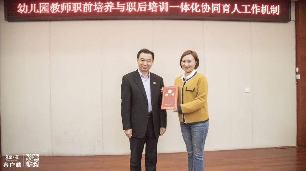 10月26日,襄阳直属机关第二幼儿园园长、襄阳市隆中名校长黎燕从湖北文理学院教育学院院长汪家宝手中接过“双向互聘”证书,成为湖北文理学院教学学院学前教育专业兼职教师。当天,曹军、朱燕萍、朱红等8位幼儿园园长与黎燕一起受聘为一线兼职教师。