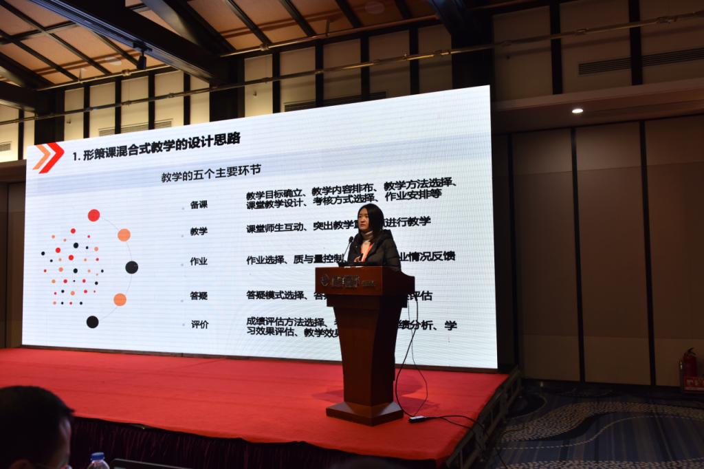 华中科技大学马克思主义学院副院长谭亚莉教授以《“形势与政策”线上线下混合教学的设计思考》为题,从“形势与政策”课混合式教学的设计思路、实现框架、效果优化等方面,具体详细地介绍了混合式教学的创新实践。